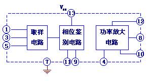HM231的内部结构及工作原理简图如图2所示。由图可知,该电路由取样环节、相位鉴别环节功率放大环节三个单元环节组成。其工作原理可分为三部分来分析。