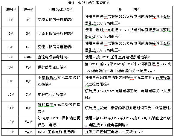 厚膜电路HM231体积小、使用方便,外接少许元件且不需任何调试。它仅用来检测三相交流电源是否缺相,但它不能判断出三相电源的相序,故本身无相序检测和相序错误保护功能。
