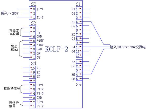 KCLF-2发电机励磁控制板对外共有5个接插件,分别为S1、S2、S3、S4、S5,正确的接线方法应为: