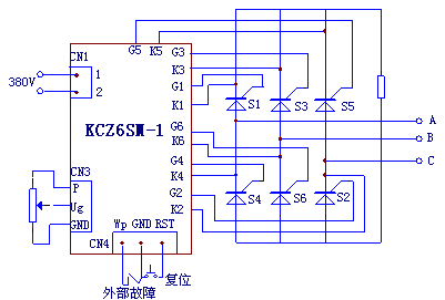 6.KCZ6SM-1数字式晶闸管开环触发控制板标准使用是不用同步变压器,直接用于工作系统线电压≤660V的系统中(出厂时按380V选择的电阻),当用户系统工作电压高于660V或电压很低(低于10V)时,建议使用同步变压器,同步变压器二次侧线电压为380V,此时对应G1、K1