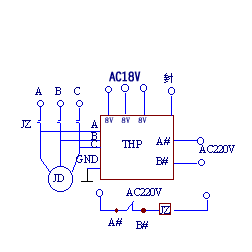 图2给出了THP型保护板用于三相交流电机的缺相保护电路中的工作原理示图。图中JZ为主接触器。