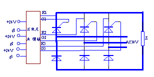 MJ3型三单元晶闸管触发脉冲末级板 一、概述 MJ3型三单元晶闸管触发脉冲末级板是在两单元触发脉冲末级板的基础上增加了一个单元而生产的,它是为三相半波或三相桥式半控整流或三相半波逆变电路中晶闸管的触发而设计的,还可以用于主功率器件为双向晶闸管的三相交流调压系统中。 二、使用方法 三单元晶闸管触发脉冲末级板的外形尺寸为:长×宽×高=97mm×90mm×30mm,其实际元件排列示意图如图1所示。应用中接插件S1中的+24V、g1;g2;+24V、g3分别接脉冲触发板的三路脉冲输出,而接插件S2中的G1、K1;G2、K2;G3、K3分别接主电路中三个共阴极或共阳极接法的晶闸管的门阴极。图2给出了该三单元未级板用于三相半控桥整流系统中的原理图。