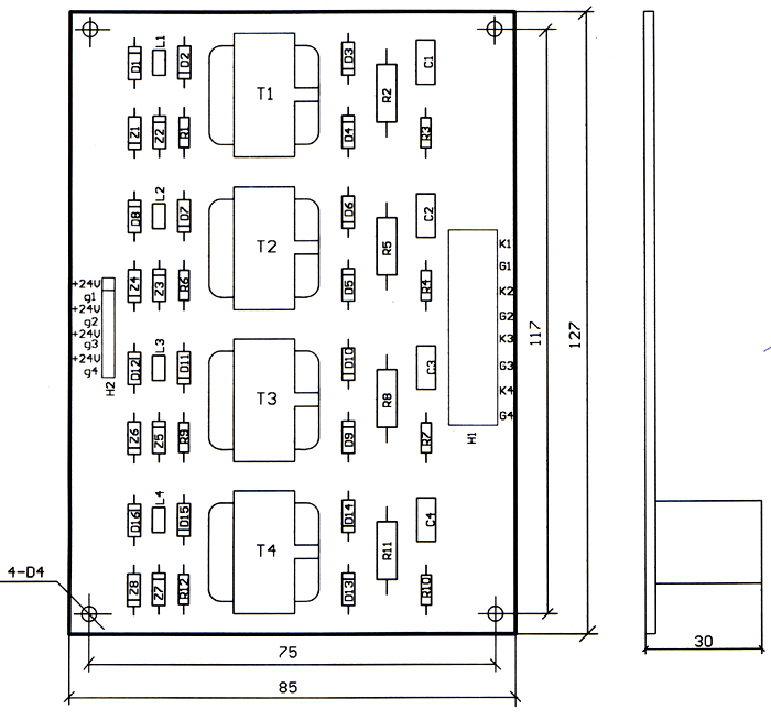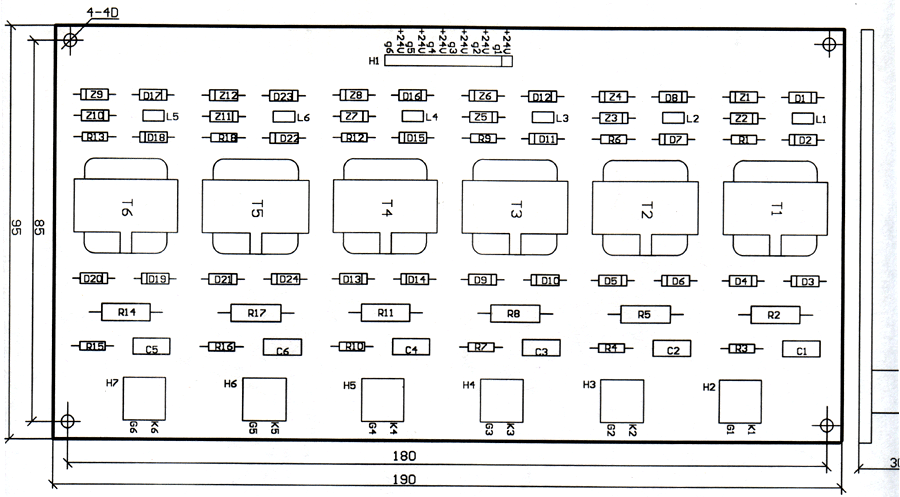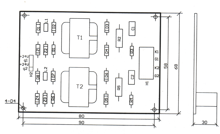 一、概述 MJ4型四单元晶闸管触发脉冲末级板是在三单元触发脉冲末级板的基础上增加了一个单元而形成的,它是为单相桥式全控整流或单相桥式逆变工作电路中的四个晶闸管的触发而设计的。 二、使用方法 MJ4型四单元晶闸管触发脉冲末级板的外形尺寸为:长×宽×高=127mm×85mm×30mm,其实际元件排列示意图如图1所示。应用中接插件S1中的+24V、g1,+24、g2,+24V、g3,+24V、g4分别接脉冲触发板的四路脉冲输出,而接插件S2中的G1、K1;G2、K2;G3、K3;G4、K4分别接主电路中四个晶闸管的门阴极。图2给出了该四单元未级板用于单相桥式整流系统中的原理图。