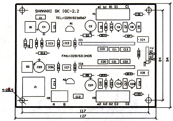 IGC2.2型单相半桥大功率IGBT门极驱动板的元件排列如附图1所示,其印制板的外形尺寸为:长×宽×高=127mm×94mm×30mm,其安装孔距为长×宽=117mm×84mm,安装孔为4-4.5它与外部的连线共有四个接插件,各插件的对外引线功能及用法如下: