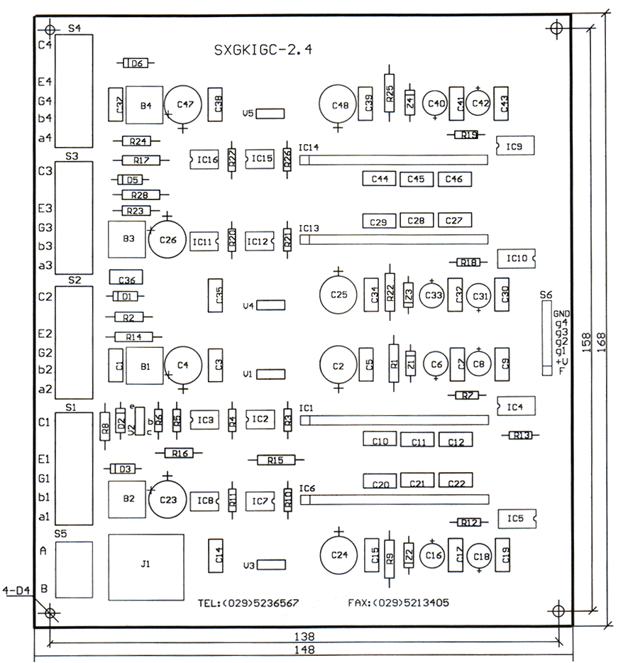 5.接插件S5中的+V、GND、g1、g2、g3、g4分别接用户系统的工作电源及正电源的参考地和四路驱动脉冲信号,而其L端则为保护后提供给用户系统的封脉冲信号,该信号可直接用来封锁脉冲形成部分的输出。