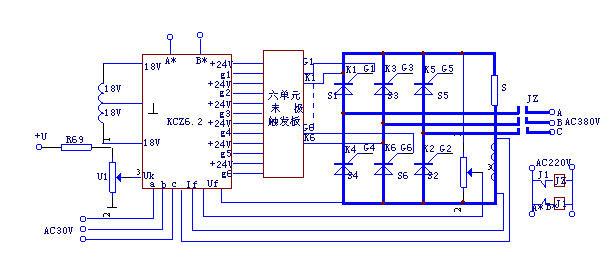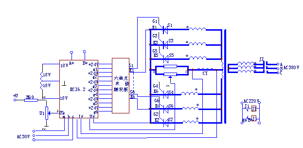 KCZ6.2板用于这类系统中的原理如图6所示,图中S1~S6六只晶闸管的门极触发信号来自KCZ6.2板输出的六