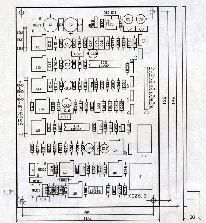 3.1 KCZ6.2板的外形尺寸为:长×宽×高=145mm×105mm×30mm,板上 主要元器件的位置及元件标号、对外引线接插件及信号名称如附图1所示。其安装尺寸亦如附图1,为四孔安装,孔径φ4,孔距示意如附图1 |