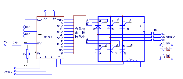 KCZ6.3板可用于三相全控桥,三相半控桥及三相半波开环可控整流电路中,图2给出了KCZ6.3板用于三相全控整流系统中的原理示图,图中CT为电流传感器。