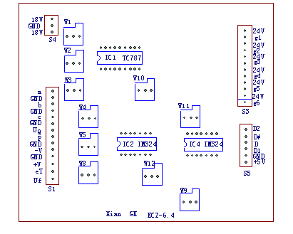 1.2 插件S1中的a、GND,b、GND,c、GND分别接三相同步变压器副边的对应A、B、C三相的三个30V绕组,当主回路不带变压器时,在KCZ6.4用于三相可控整流系统时,建议同步变压器接为Δ/Y-11,而当KCZ6.4用于三相交流调压时,建议同步变压器接为Y/Y-12,在主回路带有变压器时,同步变压器的接法应与主变压器相匹配。而Ug、P、GND分别接外部给定电位器(阻值不小于4.7K,功率不小于0.5W)的三端,其中Ug为该电位器的中间可调端,而GND与P分别接该电位器的两固定端,eT、GND接取样传感器的输出(如热电偶的输出),而Uf接实际输出取样值,剩余的+V、-V及GND为用户提供了一正电源及负电源输出信号。