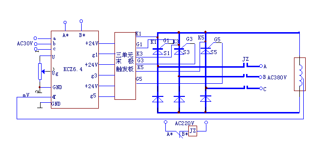 用于三相晶闸管闭环控温系统的原理电路如图2所示,图中KCZ6.4板用于过流保护模式工作。其