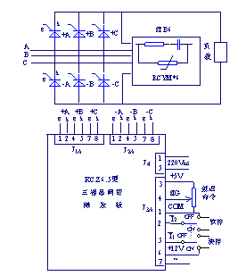 电路原理如图4所示。通过改变晶闸管的门极延迟角的大小,负载便可以得到幅值可变的三相交流电压。而通过附加的电压或者电流调节器板构成闭环、则能够实现稳定控制。
