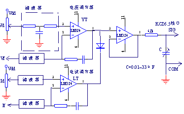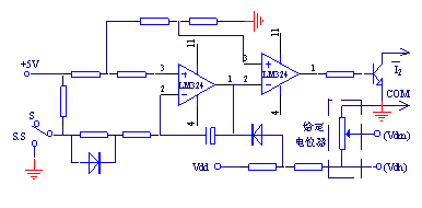 图3示出软起停控制电路,电位器为给定电位器,例如图2中的电压给定电位器;I2是KCZ6.5触发板的软停控制端,为低电平时触发板开始软停、触发脉冲延迟角从原值以一定的速度滑到最大值处;为悬空状态时触发板软起,触发脉冲移动正好相反,当开关拨到S.S(软起动)侧时,电位器的Vdh端的电压按照一定斜率上升,当其达到设定值时软起动结束。当开关拨到S(软停止)侧时,Vdh端的电压按照一定斜率下降直到为零、软停止结束。