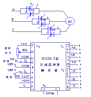 3.按标准电路联接图,将J1和J2对应于6只SCR的十二根导线与SCR的门极和阴极相联,导线长度最好勿超过50厘米,每一对导线(同一个SCR的门极和阴极)应绞合一下,至少为每2.5厘米绞一绞。这样在大功率应用时可减少高频杂波的干扰。一般-A、-B、-C三个SCR阴极的引线同时也是引入同步信号的。因此这十二根导线要一一对应,不能接错。