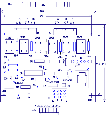 6.在SCR没有接通三相电源的情况下,接通J4或J3上①、②端的交流电压使板上得到交流220V或24V电源。板上电源指示灯(绿)、缺相指示灯(红)、禁止指示灯(红)三只LED应发亮。