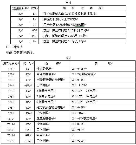 3) 调整速度挨饿量电位器RP9/V,测量TP10/VF点电压,对应电机额定转速为负8伏。
