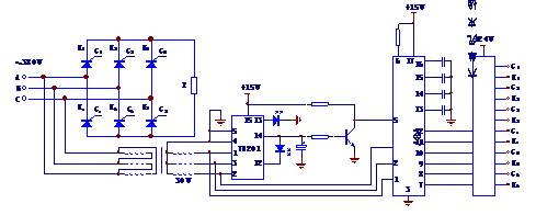 图4给出了TH201经三相隔离降压变压器用于三相晶闸管整流系统中的原理示图。这里TH201的输出经电平匹配后直接接TC787的脉冲封锁端,一旦发生缺相或错相,则TH201的保护电路动作,封锁掉TC787的输出脉冲。