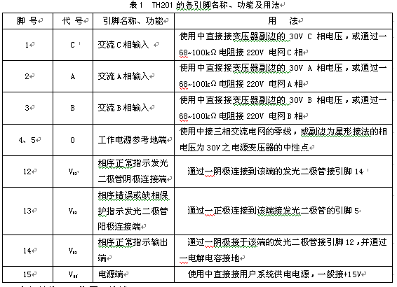 TH201应用中,在三个交流输入端外接三个68~100kΩ的电阻(功率1/2W)后接入三相四线制380V,或直接接三相30V(有效值)测其相序。使用中应把脚4接三相交流电源的零线,脚5接控制电源的地,脚4与脚5相连。当三相相序正常或不缺相时,脚14输出高电平,脚13为低电平,接于脚14与地之间的发光二极管亮;当三相缺一相、两相或三相相序接错时,则脚14输出低电平,接于脚13和12之间的发光二极管亮,同时脚14输出的低电平信号经外电路带动继电器或封锁脉冲。