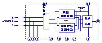 该电路将取样电路输出的信号进行逻辑鉴别,相序正确时缺相判断电路不工作,功放电路也不工作,直流继电器不动作。如相序错相,则输出信号经功放电路放大后输出低电平,外接直流继电器动作,按用户的使用状况封锁脉冲或切断电源装置的供电。