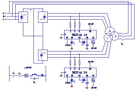 图3 应用两只TH221A于三相二重桥逆变类电力电子设备中的示图 |