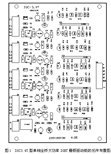 IGC3.4T型单相全桥大功率IGBT栅极驱动板的元件布置如图1所示,其印制板的外形尺寸为长×宽×高=220mm×150mm×30mm,安装孔距为长×宽=205mm×125mm,安装孔为4-Ф5。它与外部的连接共有六个接插件。