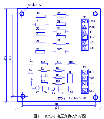 1.概述 电压变换板主要用于将主电路的直流高压变换成控制板所需的电压反馈信号,电压变换板由高阻输入网络及差模运算放大器组成,所需工作电源可由触发板提供,使用时将X0接线端子的正负端直接接到主电路。 2.主要技术参数 (1) 输入额定电压:DC:440V,220V,110V。 (2) 最大输出电压:8V。 (3) 工作电源:±15V/20mA。 (4) 最大外形尺寸:140×120×30(mm3)请参考图1。